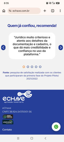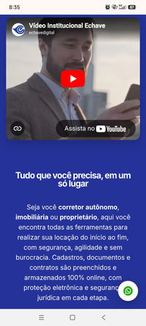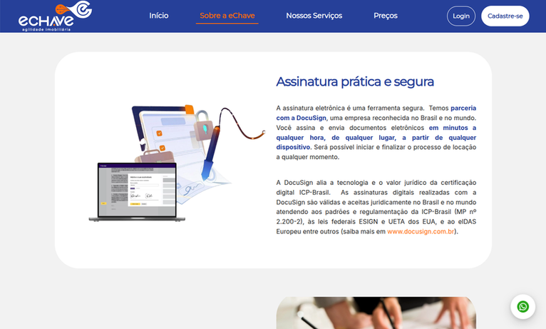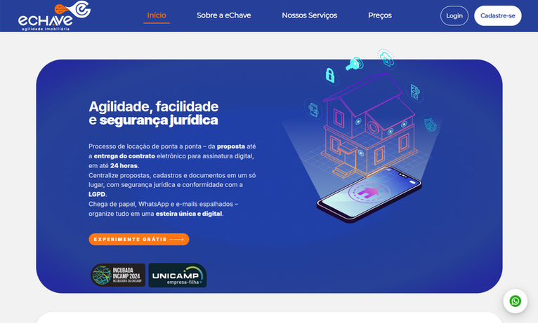 A eChave é uma plataforma 100% digital que facilita todo o processo de locação, compra e venda de imóveis, desde o início até a entrega das chaves. A empresa oferece uma solução completa para corretores autônomos, imobiliárias e proprietários, permitindo que todas as etapas sejam realizadas de forma digital, segura e sem burocracia, utilizando qualquer dispositivo eletrônico, seja computador, notebook, tablet ou smartphone. Com foco em segurança jurídica e praticidade, a eChave acompanha todo o processo online, garantindo agilidade e eficiência na gestão imobiliária.